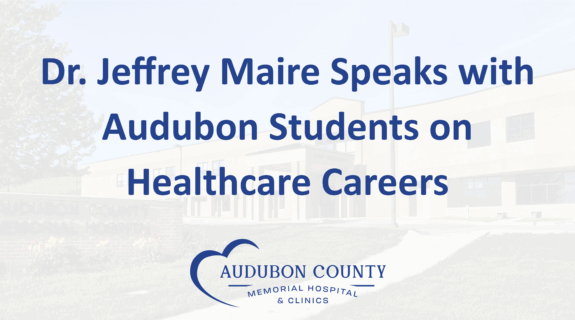 “The only way to do great work is to love what you do. If you haven’t found it yet, keep looking. Don’t settle.” Dr. Jeffrey Maire, General Surgeon at Audubon County Memorial Hospital began his presentation with this quote from Steve Jobs. In front of an auditorium of students from 8-12th grade, Dr. Maire talked about career paths and the unexpected twists and turns your life may take.